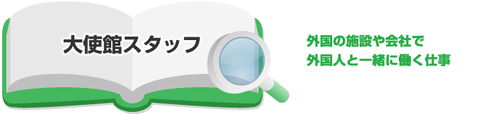 | 他にも大使館スタッフに関係する職業として外資系企業スタッフ、国際秘書、観光局スタッフ、観光局スタッフなどがあります。 | |