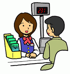 | 銀行などの窓口で働く人は、お客さまから預かった大事なお金をあつかうので、とても気をつかいます。お客さまから何かきかれたら、すぐに答えられるように、銀行の仕事の内容も、よく勉強しておかなければなりません。窓口にどんな人がいるかで、その銀行のイメージが決まりますから、いつもさわやかなえがおで、お客さんとふれあうことも大切です。また、銀行には、お客さんのお金やカードをねらう犯罪者が現れるかもしれないので、あやしい人物に注意しなければなりません。 |