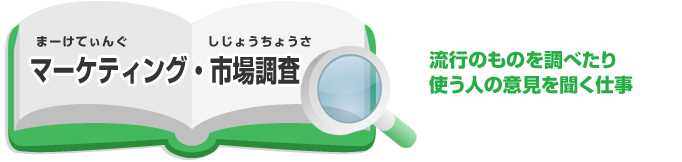 | 今、世の中では、どんなものに人気があるのかとか、みんなは、これからどんなものがほしいと思っているのかということを、アンケートなどで調べることを、市場(しじょう)調査といいます。市場調査の結果を参考にしながら、これからどんな商品を作って売り出せば、うまく売れるか、ということを考える仕事を、マーケティングといいます。どんな会社でも、新しい商品を作ったり、売り出したりするときには、必ずマーケティングを行います。 |