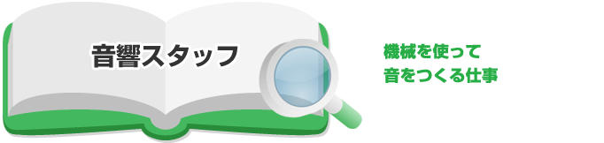 | 他にも音響スタッフに関係する職業としてレコーディングエンジニア、ミキサー、PAミキサー、音響スタッフ、音楽制作、マニピュレーター、MAミキサー、PAエンジニア、舞台機構調整技能士、サウンドクリエイターなどがあります。 | |