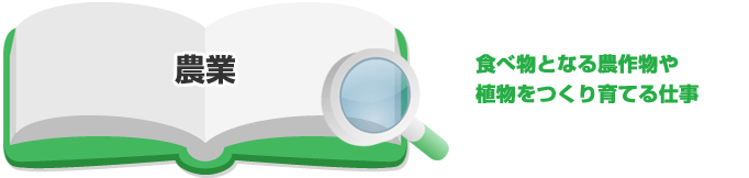 | みなさんが毎日食べるお米や野菜を作るのが農業です。田んぼでお米を作ったり、畑で麦や野菜、果物を作ったりします。お花屋さんで売る花を作るのも農業です。お米作りは、ふつう、春に田んぼをたがやして水をはり、夏前に田植えをします。あとは、草取りをしたり、肥料(ひりょう)をまいたりして、秋になると収穫(しゅうかく)します。畑では、それぞれの野菜に合った季節に種をまきますが、収穫までの期間は作物によってちがいます。また、ビニールハウスを使って、季節のちがう野菜や花を作る人もいます。 |