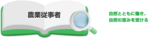 米や麦、野菜、果物など、わたしたちの食事に欠かせない作物の栽培(さいばい)を行うのが農業です。農業従事者は、土地に作物の種をまいたり、植えつけたりして生育させ、作物を収穫(しゅうかく)し、市場などで販売(はんばい)し、収入を得ています。自営でこれらの仕事をする場合は、農家といわれます。現在、農家は高齢化(こうれいか)が進んでいます。しかし、自治体によっては、この問題を解決するために、農業用地を貸す制度や、農業研修など、農業の後継者(こうけいしゃ)を育てるためのいろいろなカリキュラムを設けているところもあります。この制度を利用することにより、今まで都会で暮らしていた人が、農業に転職する例なども見受けられるようになりました。