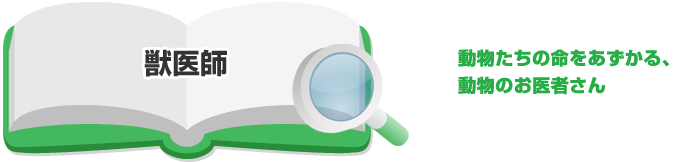 獣医師の仕事は、イヌ、ネコ、ハムスターや小鳥などの小動物を診察(しんさつ)・治療(ちりょう)し、保健・衛生面からの指導を行う動物病院の医師としての仕事だけではありません。ウシ、ウマ、ブタなどの家畜(かちく)の伝染病(でんせんびょう)を防ぎ、品種改良を行うことなども獣医師の仕事です。また、外国の家畜の伝染病が国内に持ちこまれることを防ぐ動物検疫(どうぶつけんえき)や、牛乳の細菌検査(さいきんけんさ)、食品衛生監視(しょくひんえいせいかんし)などの仕事も獣医師が行います。獣医師になるには、大学で6年間の獣医学課程を修了(しゅうりょう)し、獣医師国家試験を受けます。これに合格すれば、農林水産大臣の獣医師免許(じゅういしめんきょ)を取得することができます。大学入試の競争率は、かなり高いものですが、獣医師の資格取得後は、農林水産、公衆衛生、小動物臨床(しょうどうぶつりんしょう)、動物愛護、パラメディカル(新しい医薬品や動物用医薬品などの開発)、野生生物などのはば広い分野での仕事が期待できます。最近では、ペットブームの影響(えいきょう)で、小動物臨床分野に進む人が非常に増えました。今後も人気のある職種のひとつといえそうです。 |