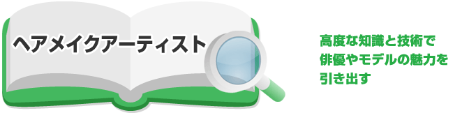 ヘアメイクアーティストは、ヘアデザインやメイクアップをする仕事です。美容師とちがって、パーマやカットなどは行いません。タレントやモデル、映画俳優などのヘアデザインやメイクのほか、ブライダルサロン、エステティックサロンなどにも活躍(かつやく)の場はあります。この仕事は、ただ、ヘアデザインやメイクをして美しく見せればいいわけではありません。特に、ファッション雑誌の撮影(さつえい)などでは、モデルの個性をいかに引き出すかも重要なポイントとなります。また、カラーコーディネートのセンスも問われます。