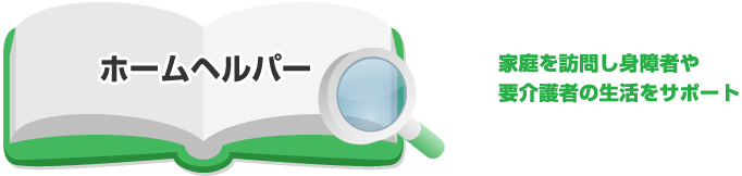 ホームヘルパーとは、日本語で言えば「訪問介護員(ほうもんかいごいん)」となり、高齢者(こうれいしゃ)や障がいのある人の家庭を訪問して、その人が日常生活を送るのに必要な手助けをする人です。