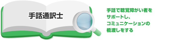 耳の不自由な人は話すことがうまくできませんから、音に代わる手話は、大切なコミュニケーション手段です。手話通訳士とは、耳の不自由な人と一般社会を結ぶパイプ役となる仕事です。手話通訳士の仕事は、単にその内容だけを伝えればそれでいいという仕事ではありません。手話とは、手の指、うでなどの型、位置、動きなどで意味を表す言語ですから、地域や年代による表現のちがい、現場による使い分け、言葉のしくみ、耳の不自由な人そのものへの理解と、それを支える福祉(ふくし)関係の知識など、手話通訳士には高い技術とはば広い豊かな知識が必要とされるのです。
