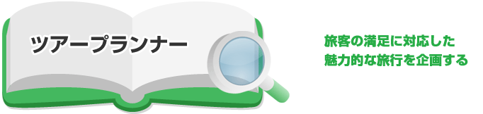 旅行プランを立てる人が、ツアープランナーです。旅行会社が行う仕事には、大きく分けて三つの業務があります。旅行の相談業務、チケットの予約・発券業務、旅行企画(りょこうきかく)の販売業務(はんばいぎょうむ)で、ツアープランナーの仕事は、旅行企画の販売業務に入ります。具体的には、旅行会社の中でツアーの企画を立てる人のことですが、旅行会社にとってツアーとは、お客さんに買ってもらう商品ということなのです。買ったお客さんが、ツアー参加者です。ツアープランナーは、多くの人に参加してもらえる魅力(みりょく)あるツアープランを出す必要があるわけですが、商品である以上、そのプランが利益につながるかどうかといった、コスト計算が必要になります。ツアー募集(ぼしゅう)パンフレットに、最低人員何人以上とありますが、それ以下の人数の場合は、商品にならないということなのです。売れる商品、つまり多くの人が参加するツアーを企画するためにツアープランナーは頭をひねり、次に、その商品を多くの人に買ってもらう営業努力もします。ツアープランナーの多くは、総合・国内旅行業務取扱主任者(そうごう・こくないりょこうぎょうむとりあつかいしゅにんしゃ)の資格を持っています。
