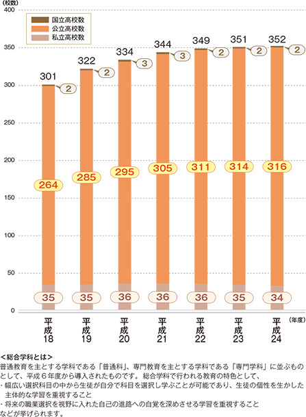 文部科学省では、全国で約500校の公立高校に総合学科を設置する(=通学範囲 に少なくとも1校整備)ことを目標としております。 |