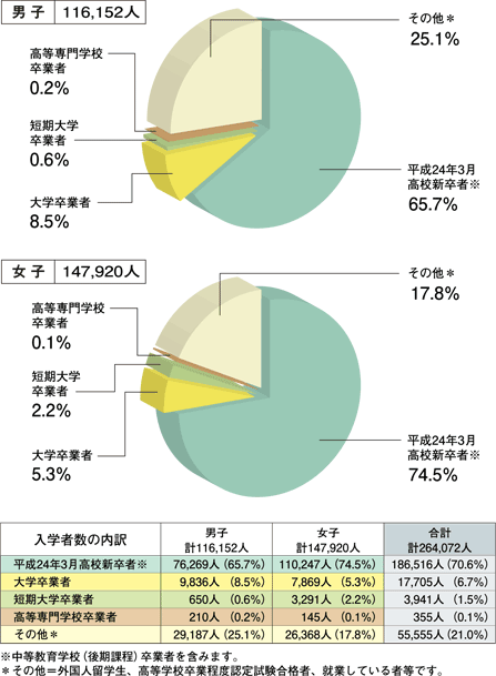 | 平成24年4月専門学校入学者のうち、同年3月に高校を卒業した学生(新卒入学者)の占める割合は、男子65.7%、女子74.5%です。 |