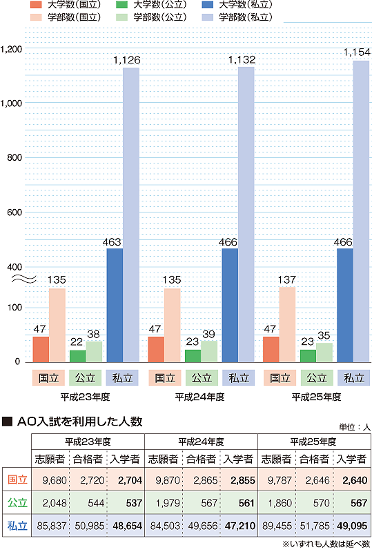 AO入試を実施した国公私立の大学・学部数(平成23~25年度)
