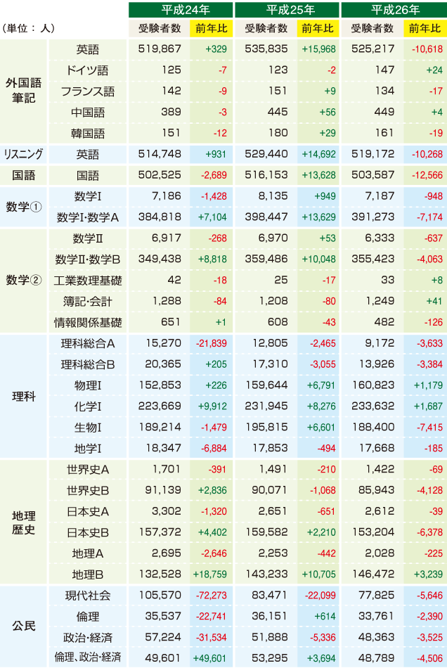 | データ資料: | 「平成26年度大学入試センター試験実施結果の概要」より <独立行政法人大学入試センター> |