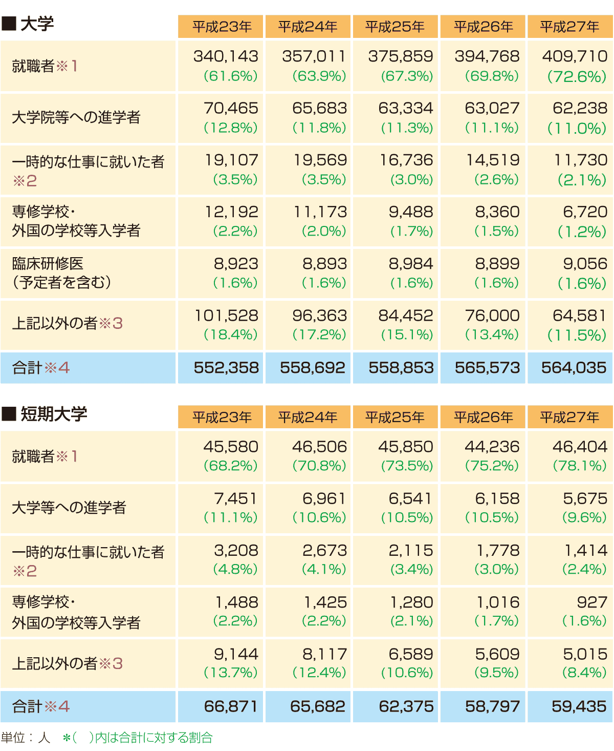 ※1 正社員および雇用期間が1年以上(1年未満であっても、継続により1年以上雇用されることが確実である者を 含む)であり、かつ勤務形態が正社員に準ずる派遣社員・契約社員を含む。 ※2 上記就職者(※1)以外または契約内容が不明の派遣社員・契約社員を含む。 ※3 各年5月1日時点で進路未決定、フリーター、国家試験等の受験準備、不詳、死亡の者等を含む。 ※4 該当年に大学・短期大学を卒業した者の数であり、入学後に中途退学等をした学生の数は含まない。 |