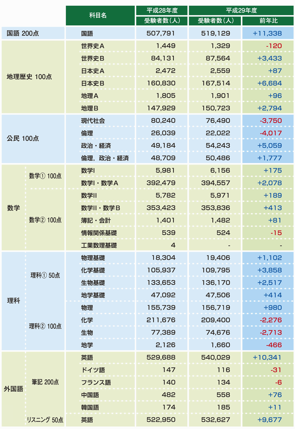 | データ資料: | 「平成29年度大学入試センター試験実施結果の概要」より 独立行政法人大学入試センターホームページより表にして作成 |