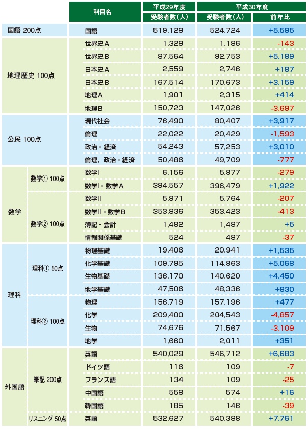 | データ資料: | 「平成30年度大学入試センター試験実施結果の概要」より 独立行政法人大学入試センターホームページより表にして作成 |