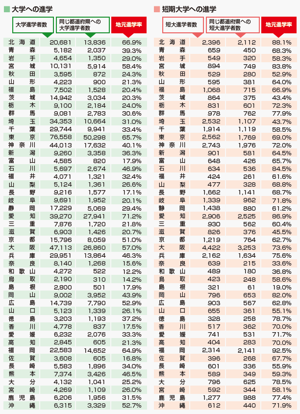 | 2018年に大学・短期大学へ進学した者(浪人含む)のうち、出身高校と同じ都道府県の 大学・短期大学へ進学した割合です。 |