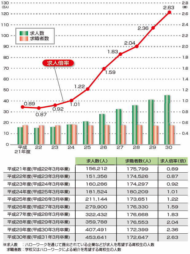 | データ資料: | 平成30年度「高校・中学新卒者のハローワーク求人に係わる 求人・求職・就職内定状況」取りまとめ(平成30年9月末現在) 厚生労働省のホームページよりグラフ・表にして作成 |