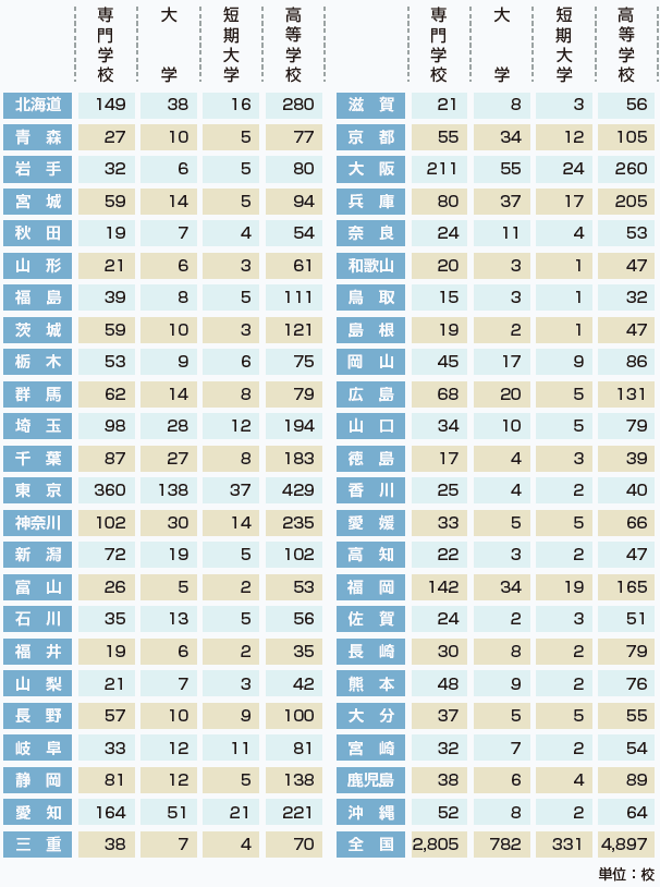 | 都道府県別/専門学校・大学・短期大学・高等学校 |