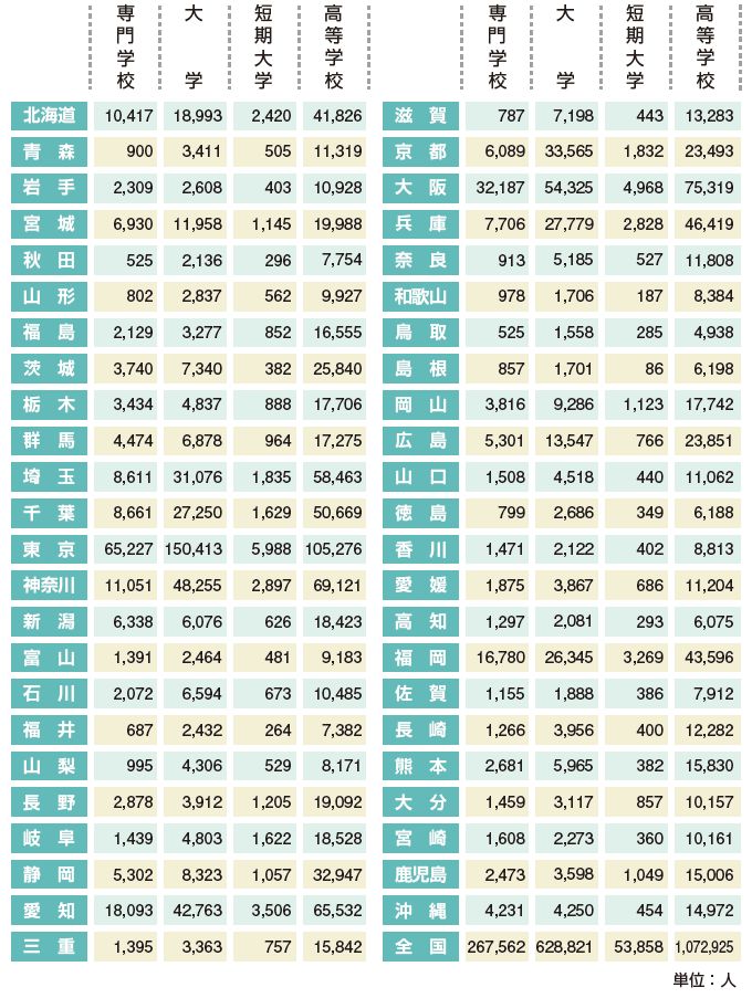 | 都道府県別/専門学校・大学・短期大学・高等学校 |