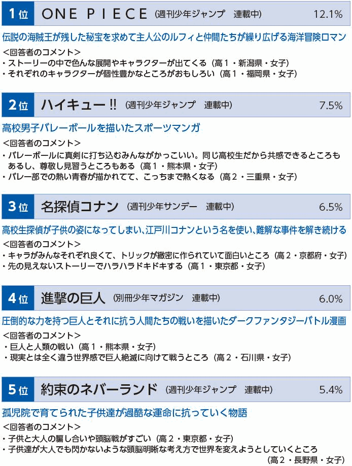 | 面白いと思う「マンガのタイトル」と、そのマンガの「面白いと思うところ」を2つまで フリーワードで回答してもらいました。 |