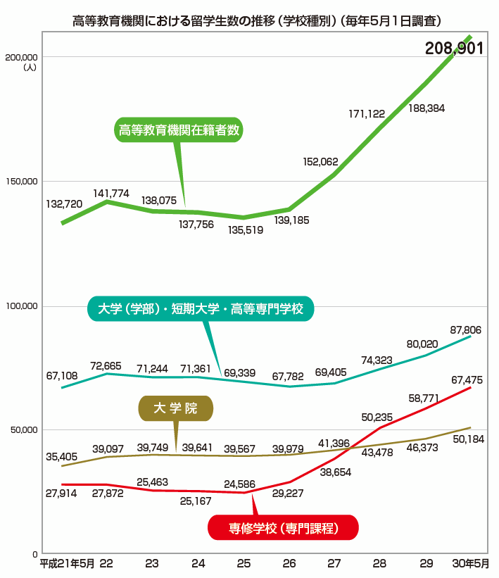| データ資料: | 「平成30年度外国人留学生在籍状況調査結果」 独立行政法人日本学生支援機構のホームページよりグラフにして作成 |