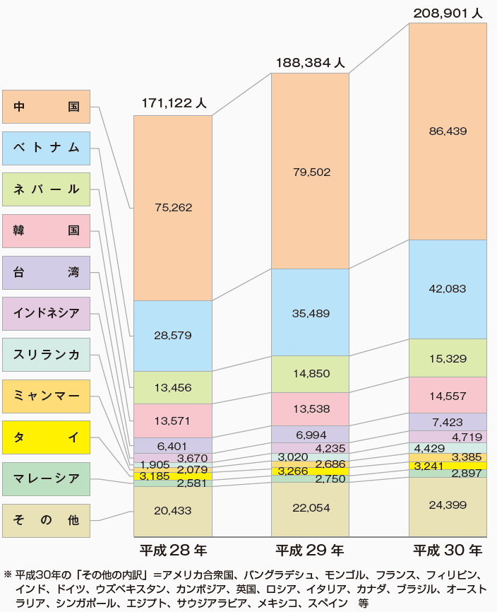| データ資料: | 「平成30年度外国人留学生在籍状況調査結果」 独立行政法人日本学生支援機構のホームページよりグラフにして作成 |