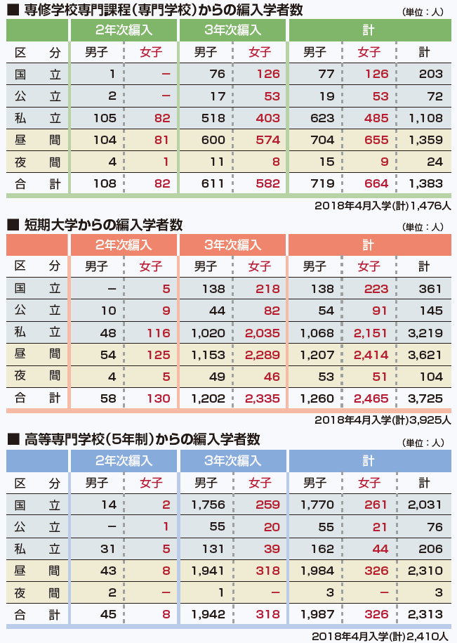 | データ資料: | 令和元年年度学校基本調査速報 文部科学省ホームページ(令和元年8月発表)より表にして作成 各表下にある昨年の編入学者数は平成30年度学校基本調査より |
