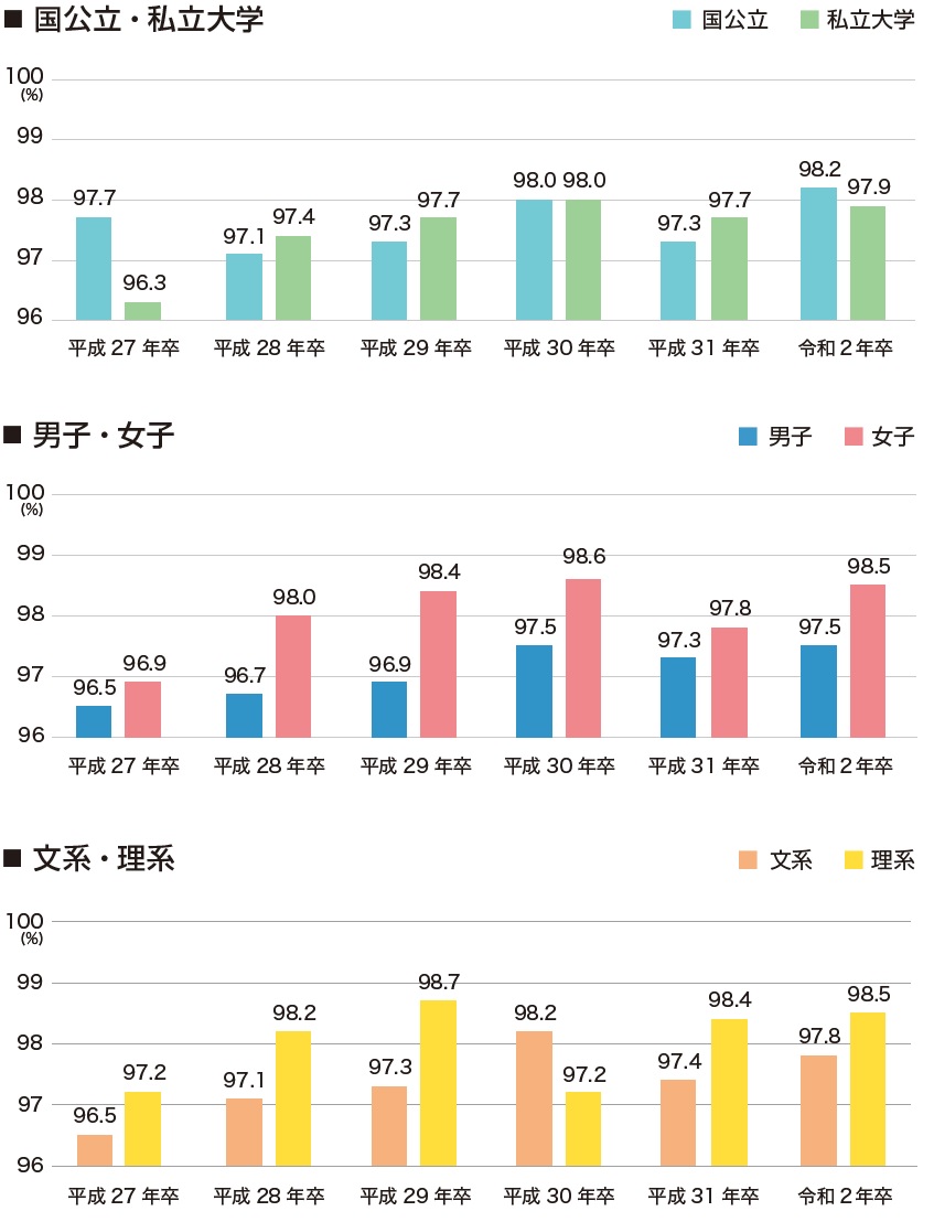 | 6年間の就職率*の推移(平成27年3月卒~令和2年3月卒) | *就職率は、就職希望者のうち、就職した人の割合です。 |