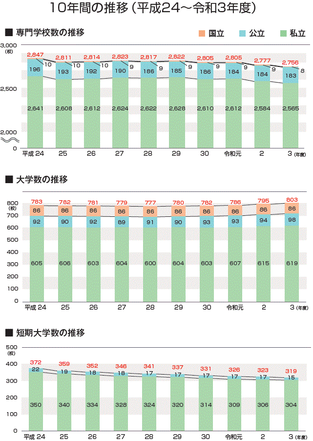 | データ資料 | : | 平成24~令和3年度の学校基本調査(文部科学省ホームページ)よりグラフにして作成。令和3年度は速報値。 |