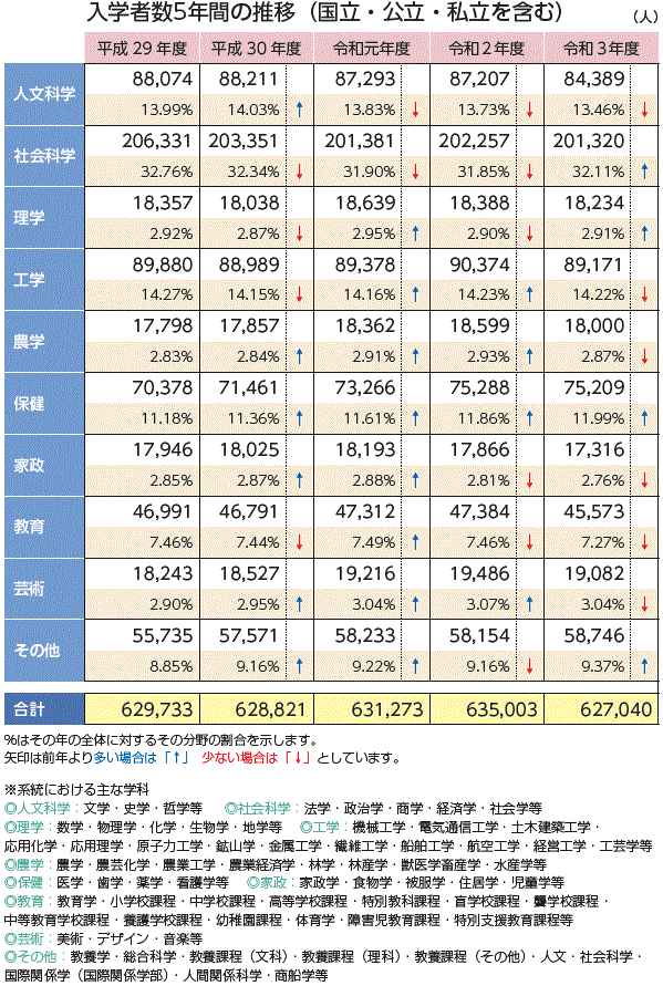 大学の分野別入学者数の推移