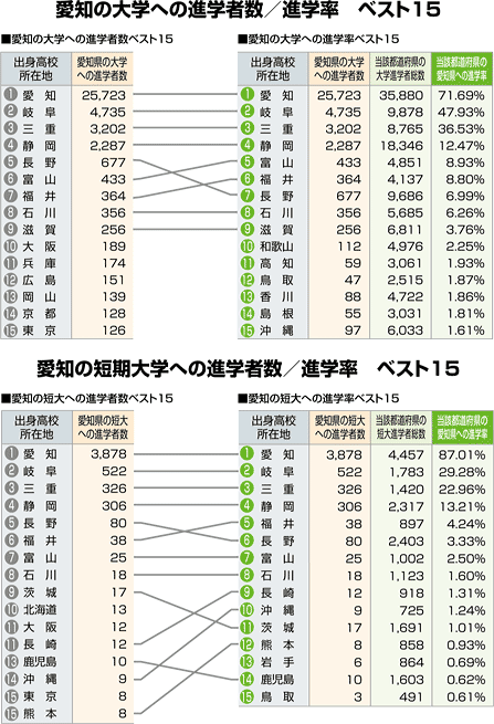 愛知への進学者数と「大学・短大進学者のうち何%が愛知に進学したか」という進学率の 2つの視点から都道府県別にまとめました。