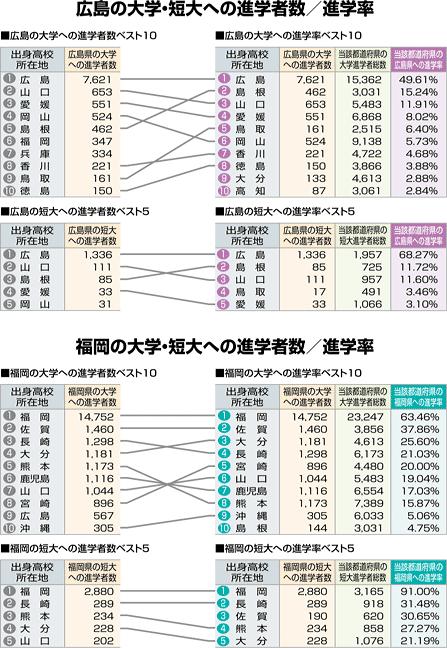 | 広島、福岡への進学者数と「大学・短大進学者のうち何%が広島、福岡に進学したか」とい う進学率の2つの視点から都道府県別にまとめました。 |