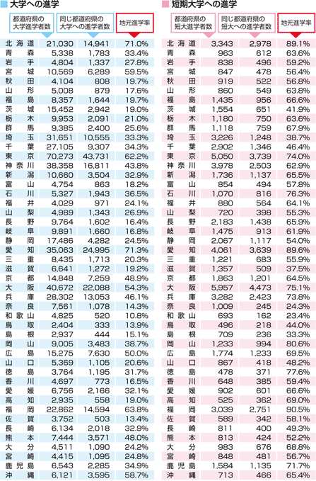 | 平成20年3月の高校新卒者が、出身高校と同じ都道府県の大学・短期大学へ進学 した割合です。 |