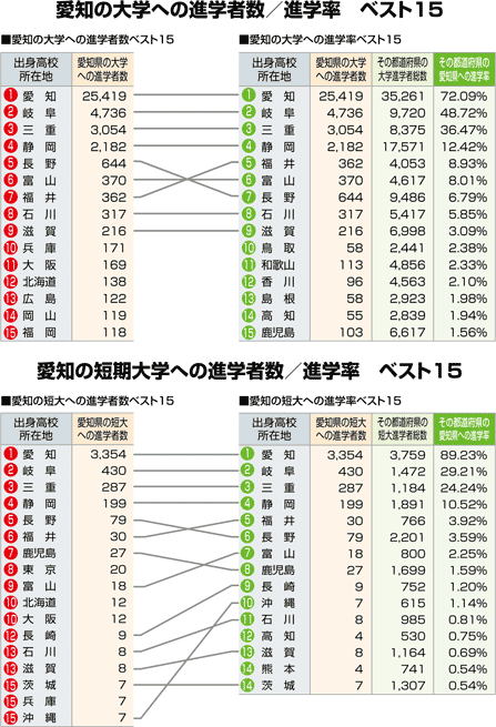 | 愛知への進学者数と「大学・短大進学者のうち何%が愛知に進学したか」という進学率の2つの視点から都道府県別にまとめました。 |
