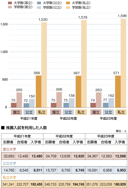 | 推薦入試を実施した国公私立の大学・学部数(平成21~23年度) |