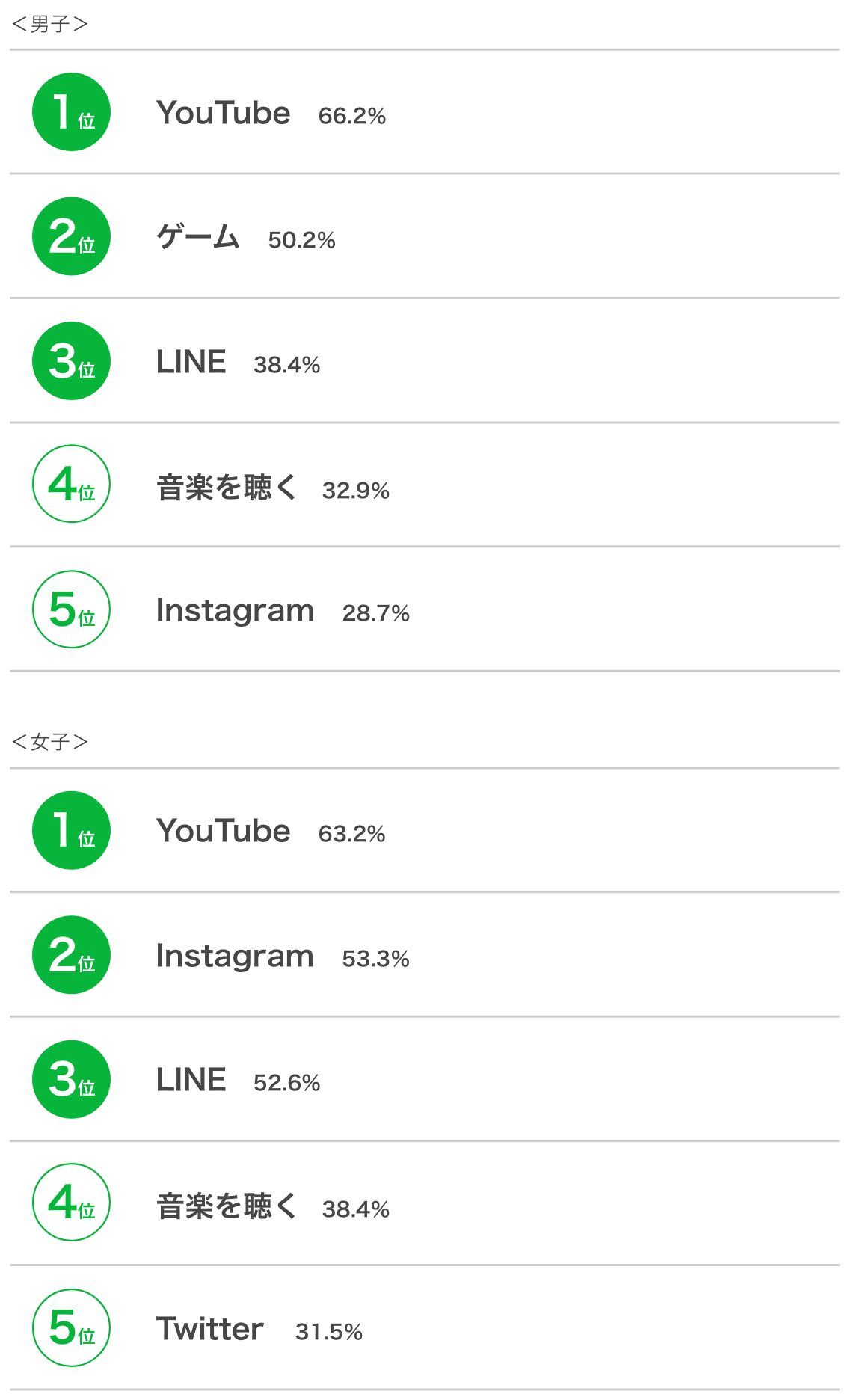 「Instagram」は、男子5位(28.7%)に対して、女子は2位(53.3%)と、男子よりも女子の利用の方が多いようですね。