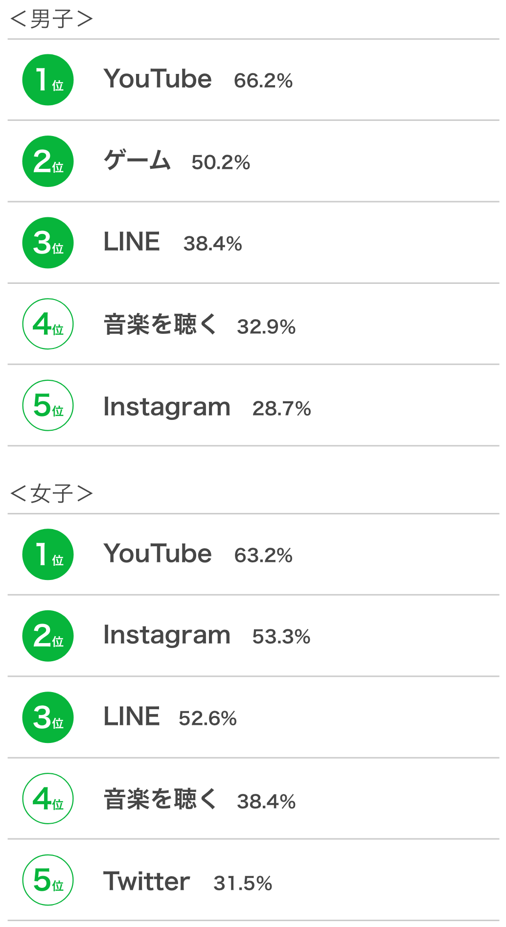 「YouTube」は、男子4位(23.2%)に対して、女子は6位(11.7%)と、女子よりも男子の視聴の方が多いようです。