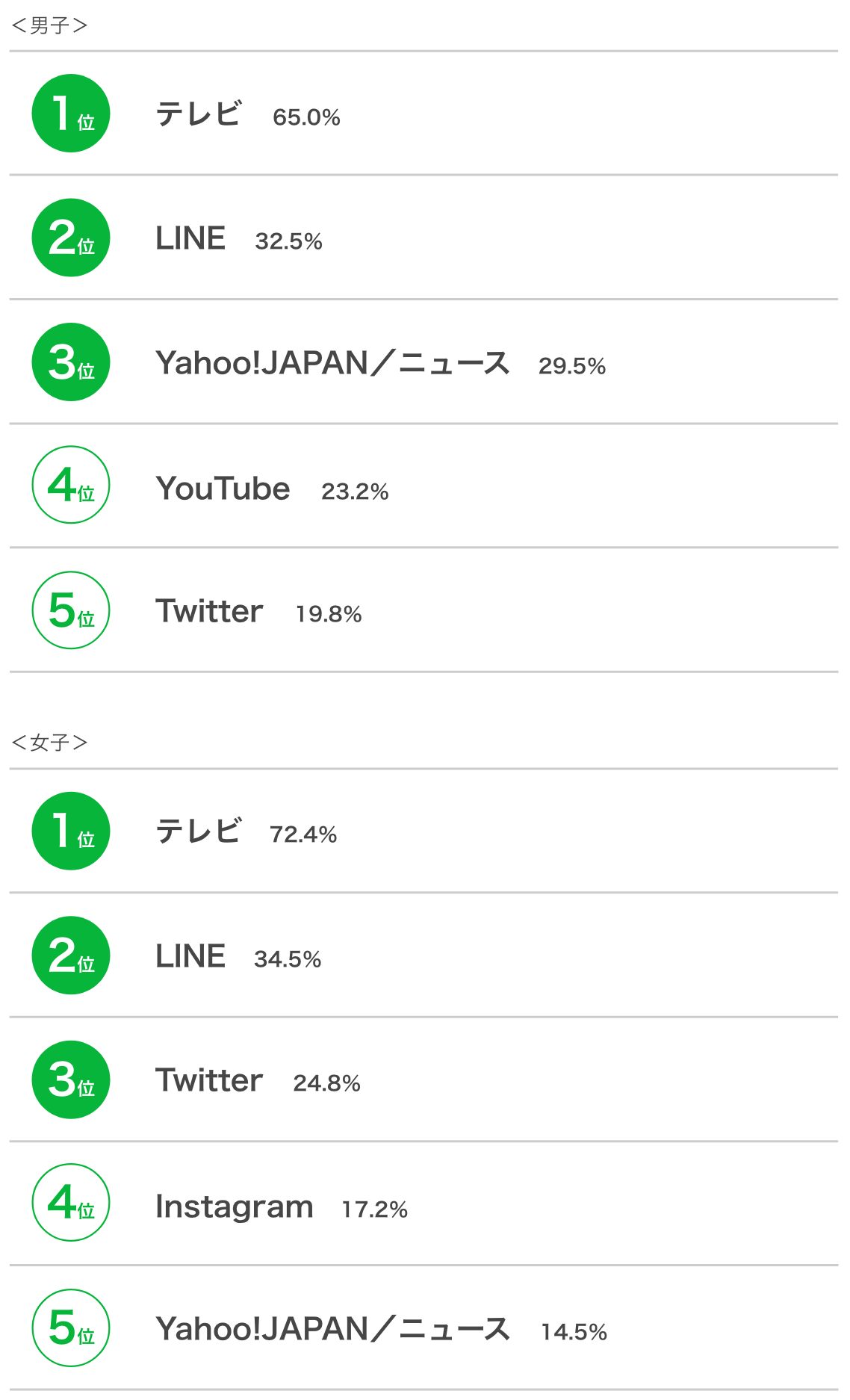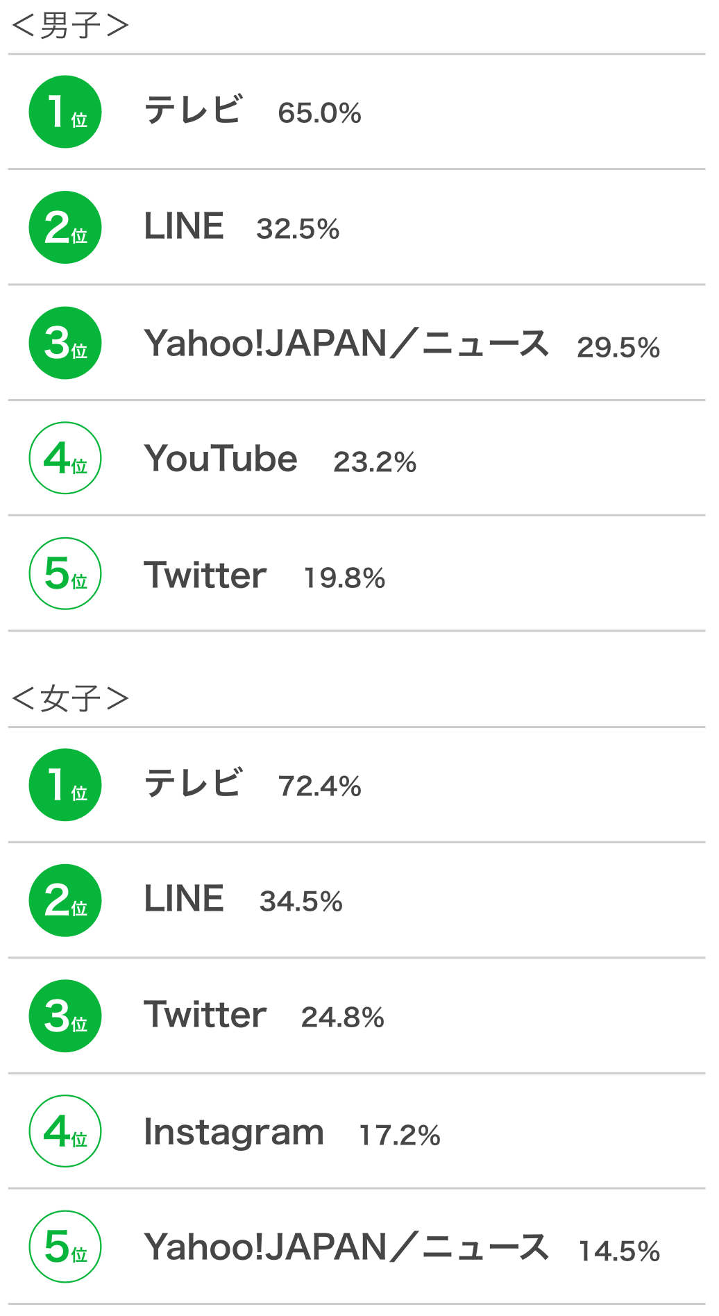 「Twitter」は、女子5位(31.5%)に対して、男子は7位(22.4%)と、女子の利用の方が多いようです。Twitterは、速報性の高いニュースを知るのに便利ですよね!