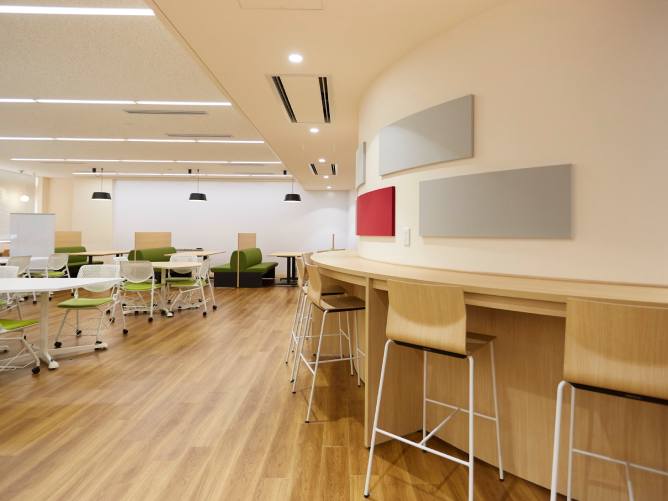• 2階には、ソファ席や可動式の席など約300名が利用可能な学生フリースペースになっています。パウダールームやコンビニも同じフロアにあり、学生の交流拠点になっています。
