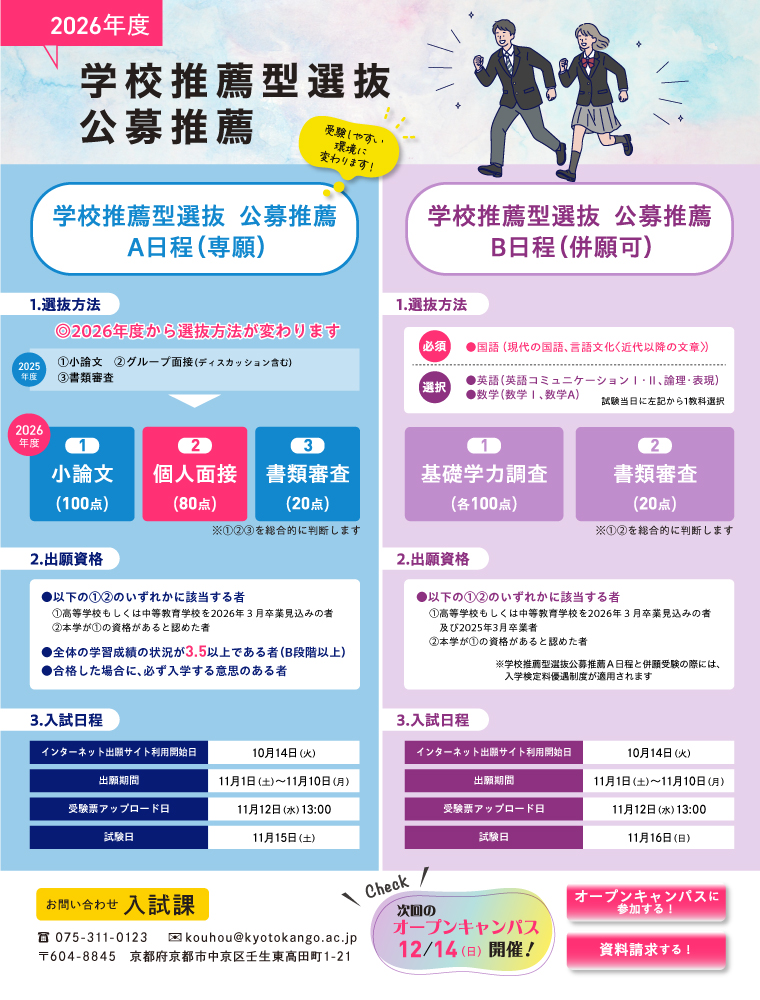 オープンキャンパス イベント一覧 すべて 来校型 オンライン型 12/14(日) 10:00~13:00 オープンキャンパス 京都府京都市中京区壬生東高田町1-21 プレゼント特典あり 友達・保護者OK 奨学金制度の紹介 12/14(日) 10:00~13:00 オープンキャンパス 京都府京都市中京区壬生東高田町1-21 プレゼント特典あり 友達・保護者OK 奨学金制度の紹介 開催スケジュールがありません。 オープンキャンパスのチェックポイント Q. オープンキャンパスに行くメリットは? A. パンフレットやホームページではわからない学校の雰囲気や特徴を知ることができる。オープンキャンパスは、校舎や施設を見学し、説明を聞いたり、質 問したりすることで、学校の雰囲気や特徴を知ることができるイベントだ。興味のある学校にいくつか参加して比較しよう。 ①入学後の生活をイメージできる 学校の雰囲気が体感でき、また授業・実習を体験できるので、入学後のイメージができる。 ②疑問を解消できる 先生や在校生に、入試や授業、学生生活で気になることなどを直接質問ができる。 ③モチベーションがアップする キャンパスを見たり、授業などを体験することで受験や進学へのモチベーションがアップする。 ④入学後のミスマッチが防げる 入学後に「イメージと違った、こんなはずではなかった」と悔やまないように、入学前に学校への理解を深めることができる。 もっと見る Q. オープンキャンパスってどんなことをするの? A. キャンパス見学や体験授業、学校の説明や個別の相談会など、学校を知ることができる絶好のチャンス!オープンキャンパスは、各学校が独自に工夫を凝らしたものとなっ ている。また、友人と参加できるのはもちろん、保護者の方が同伴できるものも多く、保護者向けの説明会や相談会を同時に開催する学校も増えている。オープンキャンパスは、気になる学校をじっくりと観察できる絶好のチャンス。その主な内容を見ていこう。 ●キャンパス見学ツアー 教室、図書館、食堂、体育施設などさまざまな施設・設備を見学。在校生たちがガイド役となって、説明しながら案内してくれる場合が多い。 ●模擬授業・体験授業 講義や実習などを体験することができる。実際に行われている研究や学びの内容を知る大変よい機会となる。 ●学校説明会 学校全体の説明から、学部・学科・コースの内容説明、就職支援体制や就職実績、奨学金制度の紹介などが行われる。保護者向けの説明会を設けている学校もある。 ●入試説明会 一見複雑な入試方式の特徴やポイントを解説してくれる。入試対策のアドバイスが聞けたり、入試対策講座を実施する学校もあるようだ。 ●個別相談会 学校の担当者に、入試、奨学金、就職支援などの疑問を個別に相談ができる。また保護者向けに個別相談の時間を設けている学校もある。 ●その他 オープンキャンパスの参加が、総合型選抜(AO入試)のエントリーを兼ねていたり、オープンキャンパス会場でエントリー受付を行っていたりする学校もある。 ■タイムスケジュール例1 9:30~ 10:00~ 10:30~ 11:10~ 12:20~ 本人 受付開始 学校説明会 模擬授業 キャンパスツアー 昼食 保護者 受付開始 保護者説明会 模擬授業 保護者相談会 昼食 ■タイムスケジュール例2 9:00~ 10:00~ 10:50~ 12:20~ スクールバス送迎 説明会 キャンパスツアー・ミニ体験授業 座談会形式「先輩と話そう」 ←―――保護者相談・個別相談(希望者)――――→ もっと見る Q. オープンキャンパスに行くための事前準備は? A. 参加予約などでスケジュールを決め、パンフレットを取り寄せて学校のことを事前に調べよう! いきなりオープンキャンパス当日に学校に行って、予約が必要だった、定員が一杯だっ た…など参加できないということにならないように、参加したい学校のオープンキャンパスに事前予約が必要かを調べ、予約できる場合は予約をしておくとあわてることがないだろう。 また、たくさんの学部や学科・コースがある学校では、さまざまなプログラムを用意しているケースが多い。知りたいことや体験してみたいことを整理し、当日参加したいプログラムを決めておくと、より効率がよいだろう。 オープンキャンパスでは、先生や在校生などに質問することも可能だ。そのために、学校のパンフレットを取り寄せて、学校のことや、興味のある学部・学科・コースのことをあらかじめ調べておき、気になった点や疑問点などは手帳やノートにメモしておいて、チャンスがあれば当日確認しよう。 もっと見る Q. オープンキャンパスに参加するときの服装は? A. 学校の担当者に不快感を与えるような服装は避ければ私服でもOKです!制服でも構いません。キャンパスツアーなど移動が多い場合もあるので、自分の動きやすい服装を選びましょう。 Q. オープンキャンパスの持ち物は? A. 筆記用具やメモ帳、学校の連絡先、地図や路線図など事前に準備をしっかりしよう。 Q. オープンキャンパスは親や友達と参加してもいいの? A. 保護者の方や友達と一