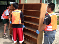 当日は、学校の呼び掛けに応えた生徒会役員など約20人の生徒が集まり、清掃作業に汗を流した。生徒たちは、自分たちが利用する立場なら、どう体育館を掃除したら気持ち良く使えるようになるかを考えながら実行。窓ふき、トイレ掃除、布団の整理、自転車の整理、床に敷かれた畳やブルーシートの雑巾がけなどを行った。さらに、雑然とした段ボールの中を整理し、中身がわかるよう文字を記した他、汚れていた玄関前をきれいにするため下駄箱を外に出し、隅々まで掃除した。