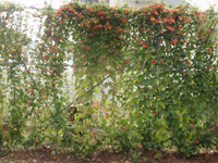 生徒たちは昨年夏、つる性植物「ツンベルギア・アフリカンサンセット」を植え、週に1度、土に液肥や肥料を与えに訪れた他、台風が近づいた際は防風ネットをかけるなどして大切に育ててきた。そして、同施設中庭のハウスパイプ(高さ2・2メートル、幅4メートル)いっぱいに広がった緑のカーテンには、鮮やかなオレンジ色の花が咲くなど、お年寄りたちの目を楽しませている。