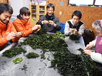 今回は3泊4日の日程で25人が参加。生徒たちは6つのグループに分かれ、地元漁師の指導を受けながら、メカブをそぎ落とす作業やワカメの芯と葉をちぎって選別する芯抜き作業を体験。最終日の夜には、漁師や地元住民から震災当時の様子や復旧復興の状況を聞き、被災地の現状を学んだ。