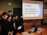 同校では2018年から5学年の生徒が東日本大震災の被災地へ研修旅行に出かけ、現地で学習活動を行っている。生徒は「被害を繰り返さないでほしい」の言葉に、「災害は誰にも関わること。普段から備える意識を高めたい」と考え、地域の防災のために何ができるかを探求している。