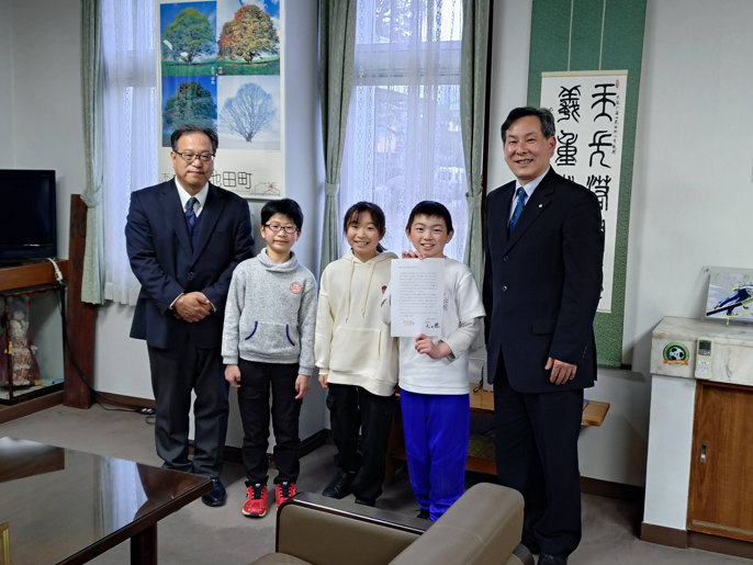 2025年2月17日、4年生の代表が町役場を訪問。町長から感謝の手紙を手渡された。