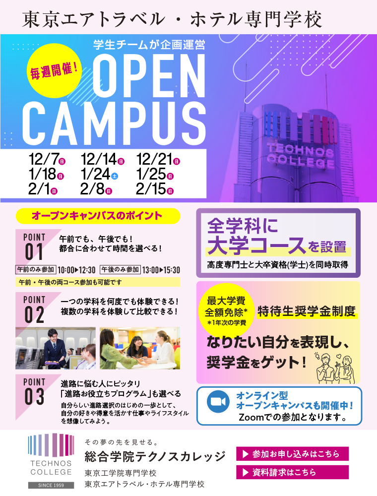 オープンキャンパス イベント一覧 すべて 来校型 オンライン型 1/18(日) 10:00~12:30 未来の自分に出会えるオープンキャンパス 東京都小金井市前原町5-1-29 友達・保護者OK 奨学金制度の紹介 交通費補助 参加する 1/18(日) 13:00~15:30 未来の自分に出会えるオープンキャンパス 東京都小金井市前原町5-1-29 友達・保護者OK 奨学金制度の紹介 交通費補助 参加する 1/24(土) 10:00~12:30 未来の自分に出会えるオープンキャンパス 東京都小金井市前原町5-1-29 友達・保護者OK 奨学金制度の紹介 交通費補助 参加する 1/24(土) 13:00~15:30 未来の自分に出会えるオープンキャンパス 東京都小金井市前原町5-1-29 友達・保護者OK 奨学金制度の紹介 交通費補助 参加する 1/25(日) 10:00~12:30 未来の自分に出会えるオープンキャンパス 東京都小金井市前原町5-1-29 友達・保護者OK 奨学金制度の紹介 交通費補助 参加する 1/25(日) 13:00~15:30 未来の自分に出会えるオープンキャンパス 東京都小金井市前原町5-1-29 友達・保護者OK 奨学金制度の紹介 交通費補助 参加する 2/1(日) 10:00~12:30 未来の自分に出会えるオープンキャンパス 東京都小金井市前原町5-1-29 友達・保護者OK 奨学金制度の紹介 交通費補助 参加する 2/1(日) 13:00~15:30 未来の自分に出会えるオープンキャンパス 東京都小金井市前原町5-1-29 友達・保護者OK 奨学金制度の紹介 交通費補助 参加する 2/8(日) 10:00~12:30 未来の自分に出会えるオープンキャンパス 東京都小金井市前原町5-1-29 友達・保護者OK 奨学金制度の紹介 交通費補助 参加する 2/8(日) 13:00~15:30 未来の自分に出会えるオープンキャンパス 東京都小金井市前原町5-1-29 友達・保護者OK 奨学金制度の紹介 交通費補助 参加する 2/15(日) 10:00~12:30 未来の自分に出会えるオープンキャンパス 東京都小金井市前原町5-1-29 友達・保護者OK 奨学金制度の紹介 交通費補助 参加する 2/15(日) 13:00~15:30 未来の自分に出会えるオープンキャンパス 東京都小金井市前原町5-1-29 友達・保護者OK 奨学金制度の紹介 交通費補助 参加する もっと見る 1/18(日) 10:00~12:30 未来の自分に出会えるオープンキャンパス 東京都小金井市前原町5-1-29 友達・保護者OK 奨学金制度の紹介 交通費補助 参加する 1/18(日) 13:00~15:30 未来の自分に出会えるオープンキャンパス 東京都小金井市前原町5-1-29 友達・保護者OK 奨学金制度の紹介 交通費補助 参加する 1/24(土) 10:00~12:30 未来の自分に出会えるオープンキャンパス 東京都小金井市前原町5-1-29 友達・保護者OK 奨学金制度の紹介 交通費補助 参加する 1/24(土) 13:00~15:30 未来の自分に出会えるオープンキャンパス 東京都小金井市前原町5-1-29 友達・保護者OK 奨学金制度の紹介 交通費補助 参加する 1/25(日) 10:00~12:30 未来の自分に出会えるオープンキャンパス 東京都小金井市前原町5-1-29 友達・保護者OK 奨学金制度の紹介 交通費補助 参加する 1/25(日) 13:00~15:30 未来の自分に出会えるオープンキャンパス 東京都小金井市前原町5-1-29 友達・保護者OK 奨学金制度の紹介 交通費補助 参加する 2/1(日) 10:00~12:30 未来の自分に出会えるオープンキャンパス 東京都小金井市前原町5-1-29 友達・保護者OK 奨学金制度の紹介 交通費補助 参加する 2/1(日) 13:00~15:30 未来の自分に出会えるオープンキャンパス 東京都小金井市前原町5-1-29 友達・保護者OK 奨学金制度の紹介 交通費補助 参加する 2/8(日) 10:00~12:30 未来の自分に出会えるオープンキャンパス 東京都小金井市前原町5-1-29 友達・保護者OK 奨学金制度の紹介 交通費補助 参加する 2/8(日) 13:00~15:30 未来の自分に出会えるオープンキャンパス 東京都小金井市前原町5-1-29 友達・保護者OK 奨学金制度の紹介 交通費補助 参加する 2/15(日) 10:00~12:30 未来の自分に出会えるオープンキャンパス 東京都小金井市前原町5-1-29 友達・保護者OK 奨学金制度の紹介 交通費補助 参加する 2/15(日) 13:00~15:30 未来の自分に出会えるオープンキャンパス 東京都小金井市前原町5-1-29 友達・保護者OK 奨学金制度の紹介 交通費補助 参加する もっと見る 開催スケジュールがありません。 オープンキャンパスのチェックポイント Q. オープンキャンパスに行くメリットは? A. パンフレットやホームページではわからない学校の雰囲気や特徴を知ることができる。オープンキャンパスは、校舎や施設を見学し、説明を聞いたり、質 問したりすることで、学校の雰囲気や特徴を知ることができるイベントだ。興味のある学校にいくつか参加して比較しよう。 ①入学後の生活をイメージできる 学校の雰囲気が体感でき、また授業・実習を体験できるので、入学後のイメージができる。 ②疑問を解消できる 先生や在校生に、入試や授業、学生生活で気になることなどを直接質問ができる。 ③モチベーションがアップする キャンパスを見たり、授業などを体験することで受験や進学へのモチベーションがアップする。 ④入学後のミスマッチが防げる 入学後に「イメージと違った、こんなはずではなかった」と悔やまないように、入学前に学校への理解を深めることができる。 もっと見る Q. オープンキャンパス