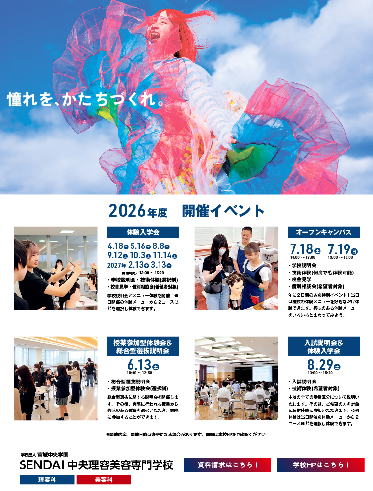 オープンキャンパス イベント一覧 すべて 来校型 オンライン型 随時 【オンライン】平日相談会 参加する 3/14(土) 13:00~15:20 【2026年3月開催】 現役の理美容師の話が聞ける職業理解セミナー 宮城県仙台市宮城野区新田東2-11-4 友達・保護者OK 参加する 3/14(土) 13:00~15:20 【2026年3月開催】 現役の理美容師の話が聞ける職業理解セミナー 宮城県仙台市宮城野区新田東2-11-4 友達・保護者OK 参加する 随時 【オンライン】平日相談会 参加する オープンキャンパスのチェックポイント Q. オープンキャンパスに行くメリットは? A. パンフレットやホームページではわからない学校の雰囲気や特徴を知ることができる。オープンキャンパスは、校舎や施設を見学し、説明を聞いたり、質 問したりすることで、学校の雰囲気や特徴を知ることができるイベントだ。興味のある学校にいくつか参加して比較しよう。 ①入学後の生活をイメージできる 学校の雰囲気が体感でき、また授業・実習を体験できるので、入学後のイメージができる。 ②疑問を解消できる 先生や在校生に、入試や授業、学生生活で気になることなどを直接質問ができる。 ③モチベーションがアップする キャンパスを見たり、授業などを体験することで受験や進学へのモチベーションがアップする。 ④入学後のミスマッチが防げる 入学後に「イメージと違った、こんなはずではなかった」と悔やまないように、入学前に学校への理解を深めることができる。 もっと見る Q. オープンキャンパスってどんなことをするの? A. キャンパス見学や体験授業、学校の説明や個別の相談会など、学校を知ることができる絶好のチャンス!オープンキャンパスは、各学校が独自に工夫を凝らしたものとなっ ている。また、友人と参加できるのはもちろん、保護者の方が同伴できるものも多く、保護者向けの説明会や相談会を同時に開催する学校も増えている。オープンキャンパスは、気になる学校をじっくりと観察できる絶好のチャンス。その主な内容を見ていこう。 ●キャンパス見学ツアー 教室、図書館、食堂、体育施設などさまざまな施設・設備を見学。在校生たちがガイド役となって、説明しながら案内してくれる場合が多い。 ●模擬授業・体験授業 講義や実習などを体験することができる。実際に行われている研究や学びの内容を知る大変よい機会となる。 ●学校説明会 学校全体の説明から、学部・学科・コースの内容説明、就職支援体制や就職実績、奨学金制度の紹介などが行われる。保護者向けの説明会を設けている学校もある。 ●入試説明会 一見複雑な入試方式の特徴やポイントを解説してくれる。入試対策のアドバイスが聞けたり、入試対策講座を実施する学校もあるようだ。 ●個別相談会 学校の担当者に、入試、奨学金、就職支援などの疑問を個別に相談ができる。また保護者向けに個別相談の時間を設けている学校もある。 ●その他 オープンキャンパスの参加が、総合型選抜(AO入試)のエントリーを兼ねていたり、オープンキャンパス会場でエントリー受付を行っていたりする学校もある。 ■タイムスケジュール例1 9:30~ 10:00~ 10:30~ 11:10~ 12:20~ 本人 受付開始 学校説明会 模擬授業 キャンパスツアー 昼食 保護者 受付開始 保護者説明会 模擬授業 保護者相談会 昼食 ■タイムスケジュール例2 9:00~ 10:00~ 10:50~ 12:20~ スクールバス送迎 説明会 キャンパスツアー・ミニ体験授業 座談会形式「先輩と話そう」 ←―――保護者相談・個別相談(希望者)――――→ もっと見る Q. オープンキャンパスに行くための事前準備は? A. 参加予約などでスケジュールを決め、パンフレットを取り寄せて学校のことを事前に調べよう! いきなりオープンキャンパス当日に学校に行って、予約が必要だった、定員が一杯だっ た…など参加できないということにならないように、参加したい学校のオープンキャンパスに事前予約が必要かを調べ、予約できる場合は予約をしておくとあわてることがないだろう。 また、たくさんの学部や学科・コースがある学校では、さまざまなプログラムを用意しているケースが多い。知りたいことや体験してみたいことを整理し、当日参加したいプログラムを決めておくと、より効率がよいだろう。 オープンキャンパスでは、先生や在校生などに質問することも可能だ。そのために、学校のパンフレットを取り寄せて、学校のことや、興味のある学部・学科・コースのことをあらかじめ調べておき、気になった点や疑問点などは手帳やノートにメモしておいて、チャンスがあれば当日確認しよう。 もっと見る Q. オープンキャンパスに参加するときの服装は? A. 学校の担当者に不快感を与えるような服装は避ければ私服でもOKです!制服でも構いません。キャンパスツアーなど移動が多い場合もあるので、自分の動きやすい服装を選びましょう。 Q. オープンキャンパスの持ち物は? A. 筆記用具やメモ帳、学校の連絡先、地図や路線図など事前に準備をしっかりしよう。 Q. オー